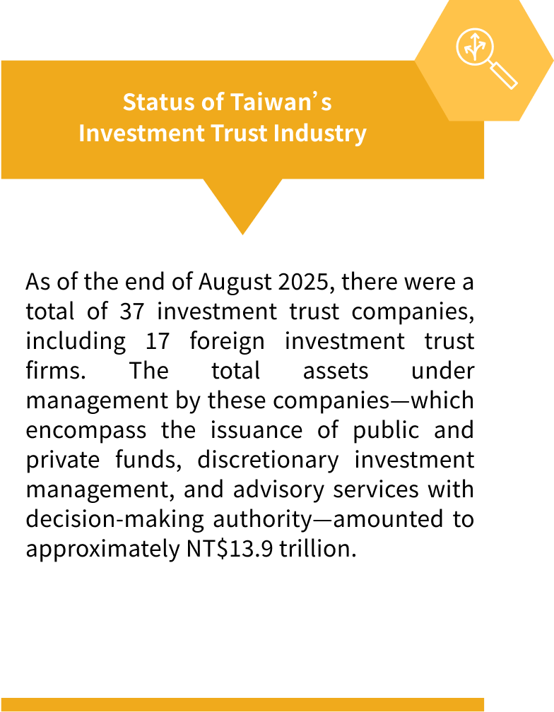 Guide foreign asset management companies to invest resources through the Incentive Policy for Offshore Funds Development in Taiwan and the “Incentive Policy for Onshore Funds”.