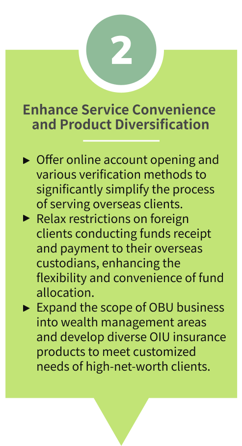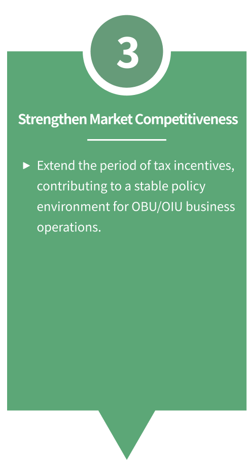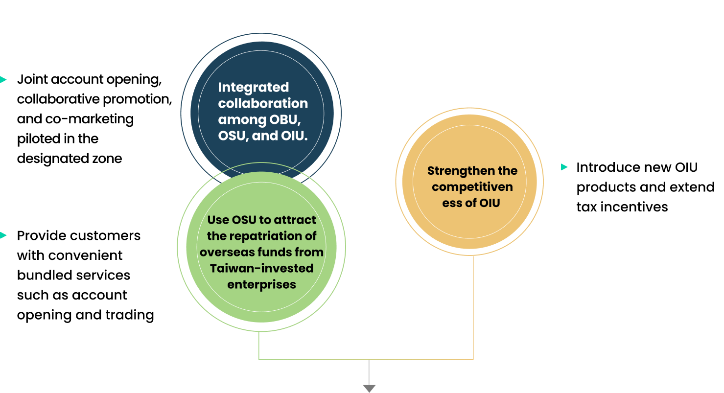The Financial Supervisory Commission (FSC) is actively promoting the internationalization of financial services. Among these efforts, Offshore Banking Units (OBUs) and Offshore Insurance Units (OIUs) play key roles. By expanding their business scope, OBUs will be able to more comprehensively assist enterprises in managing overseas assets. At the same time, OIUs will develop towards extending tax incentives and allowing the sale of more diverse insurance policies, collectively providing more competitive wealth management services for high-net-worth clients both domestically and internationally.