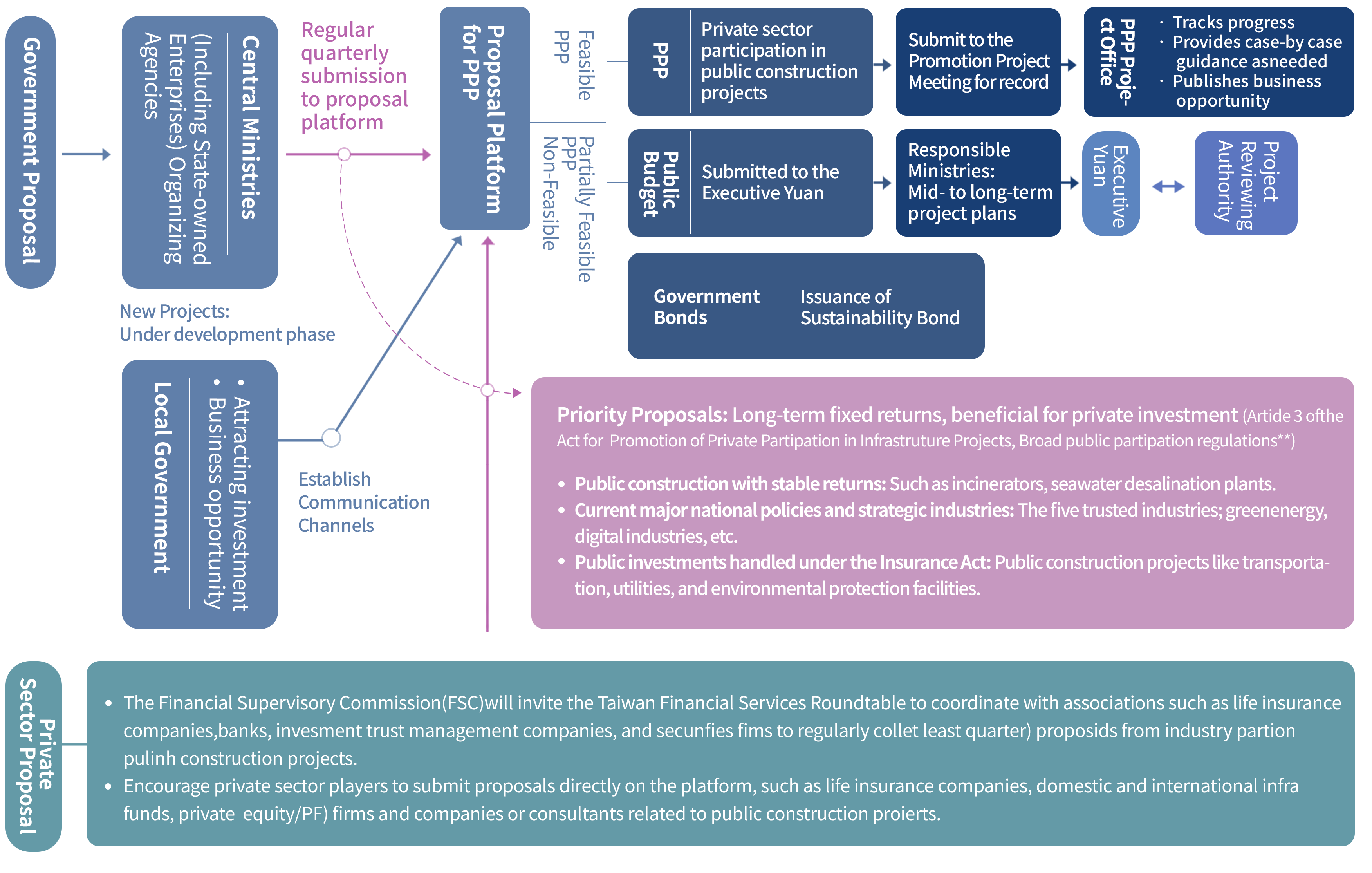 Central government ministries under the Executive Yuan are required to submit quarterly reports to the proposal platform during the feasibility assessment and planning stages of emerging public infrastructure projects. Projects that offer stable returns and are conducive to private investment will be prioritized as proposals. In addition, infrastructure projects related to major Executive Yuan policies, such as the 5+2 Industrial Innovation Plan and green energy construction, are also included in the prioritized proposal categories.
