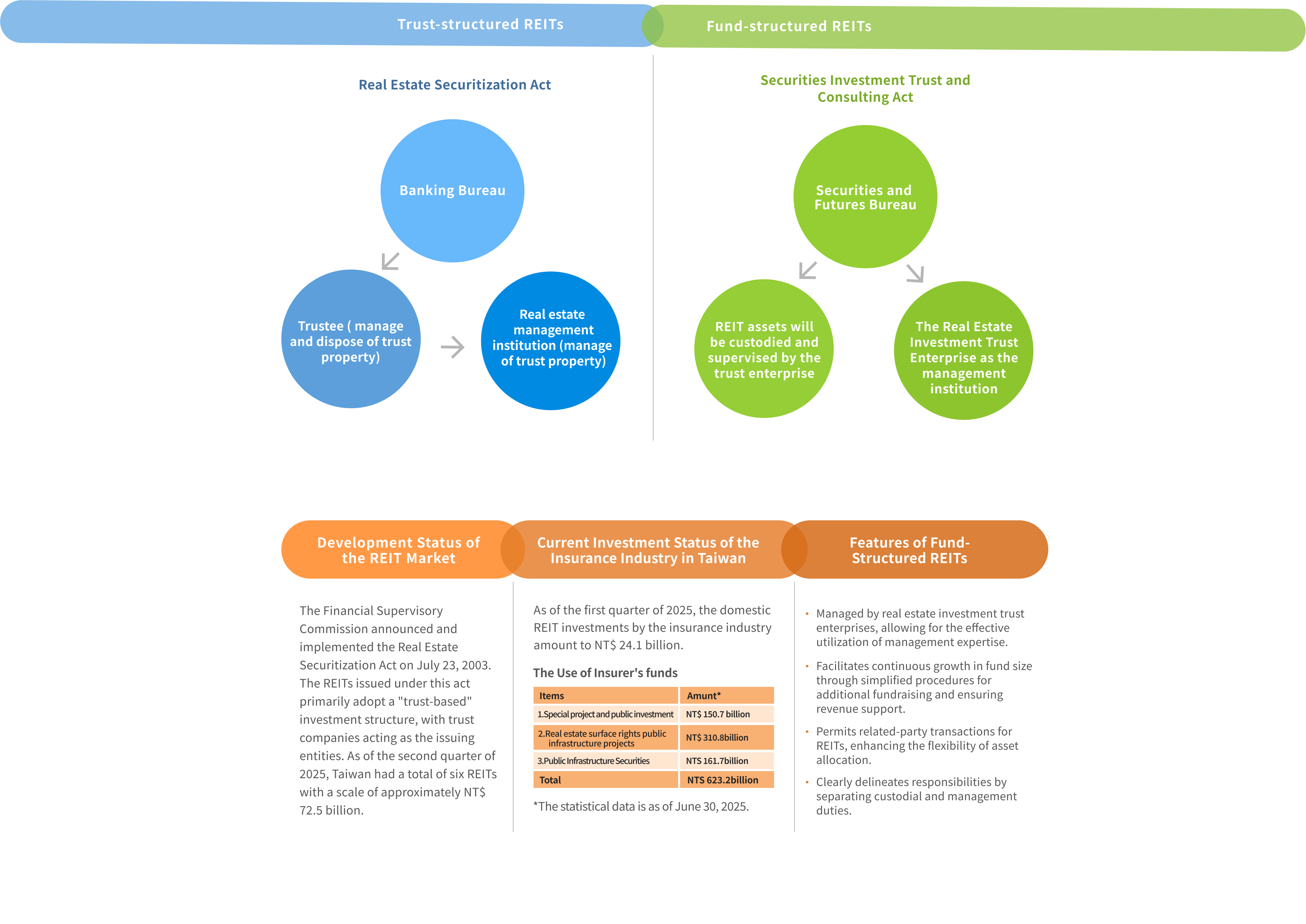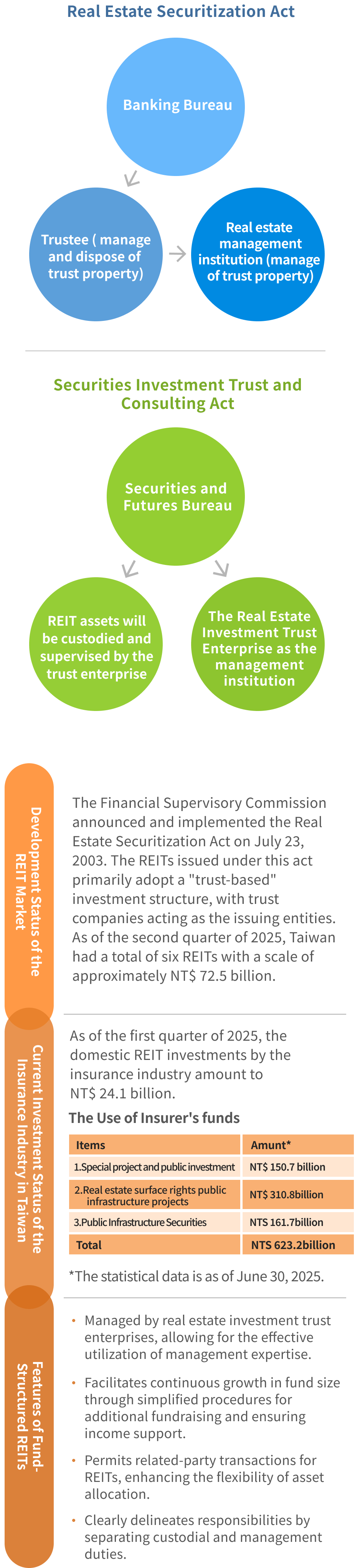 To promote the development of the REIT market, the FSC has proposed draft amendments to the "Securities Investment Trust and Consulting Act" by referring to the REIT systems in Japan, Singapore, and Hong Kong. These amendments will allow REITs to be issued under fund structure , making their operations more timely and flexible.