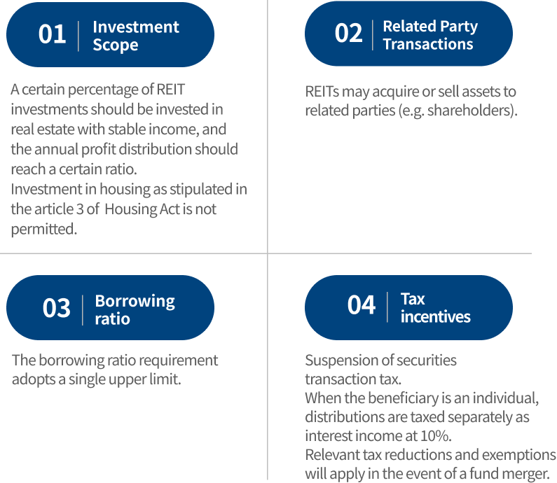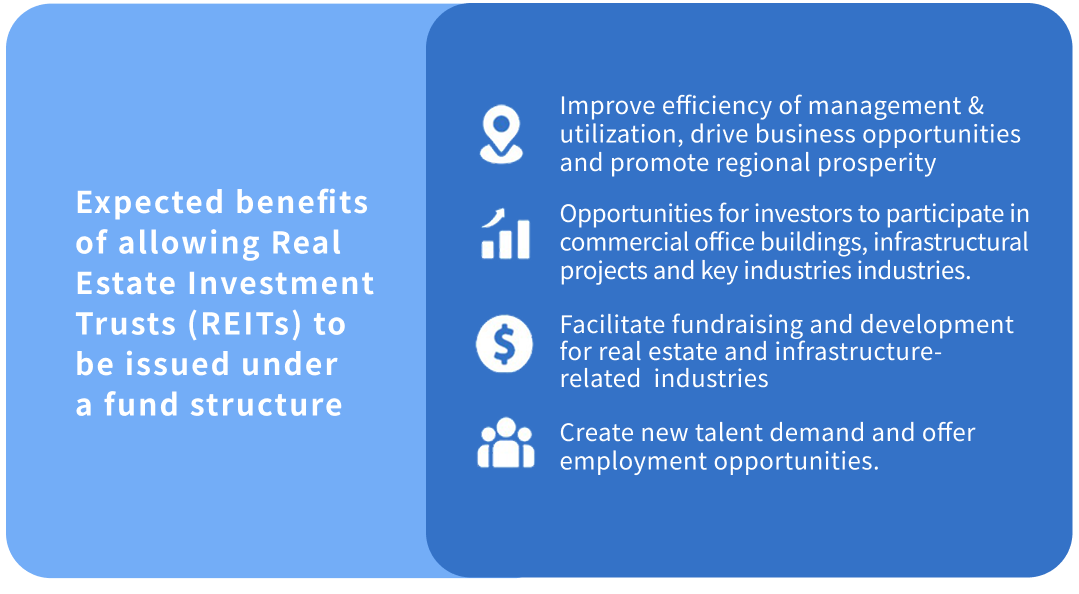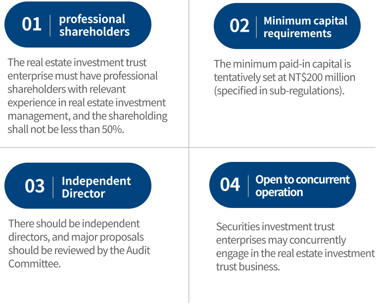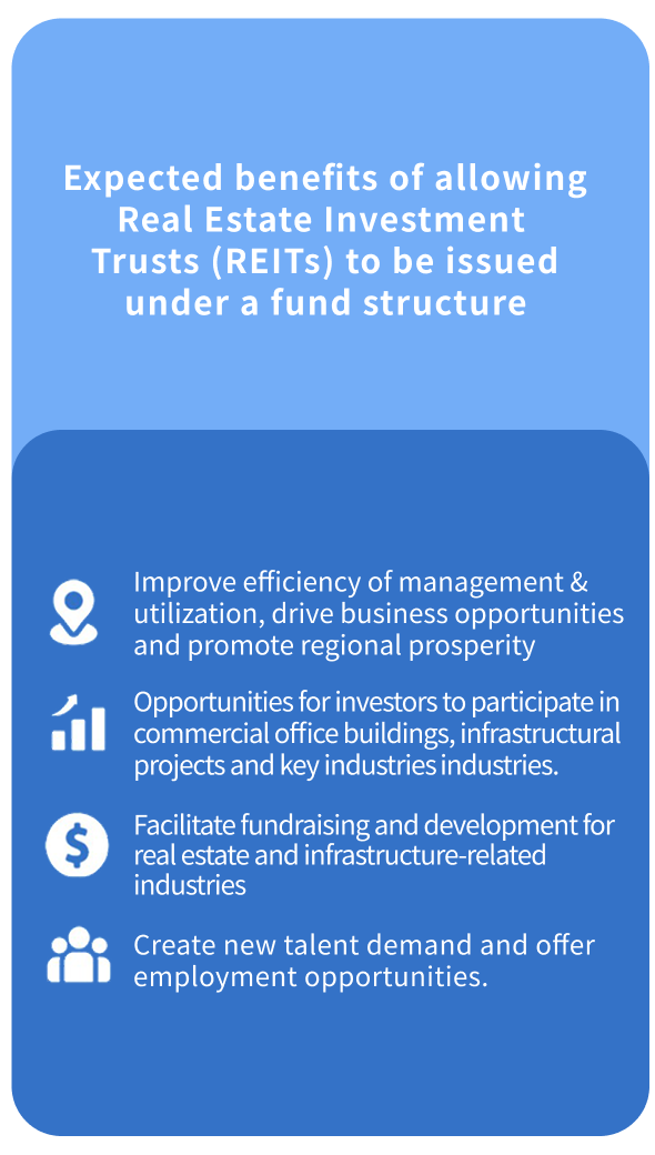 - Amend the Securities Investment Trust and Consulting Act, along with related sub-laws, to allow the issuance of REITs under a fund structure.